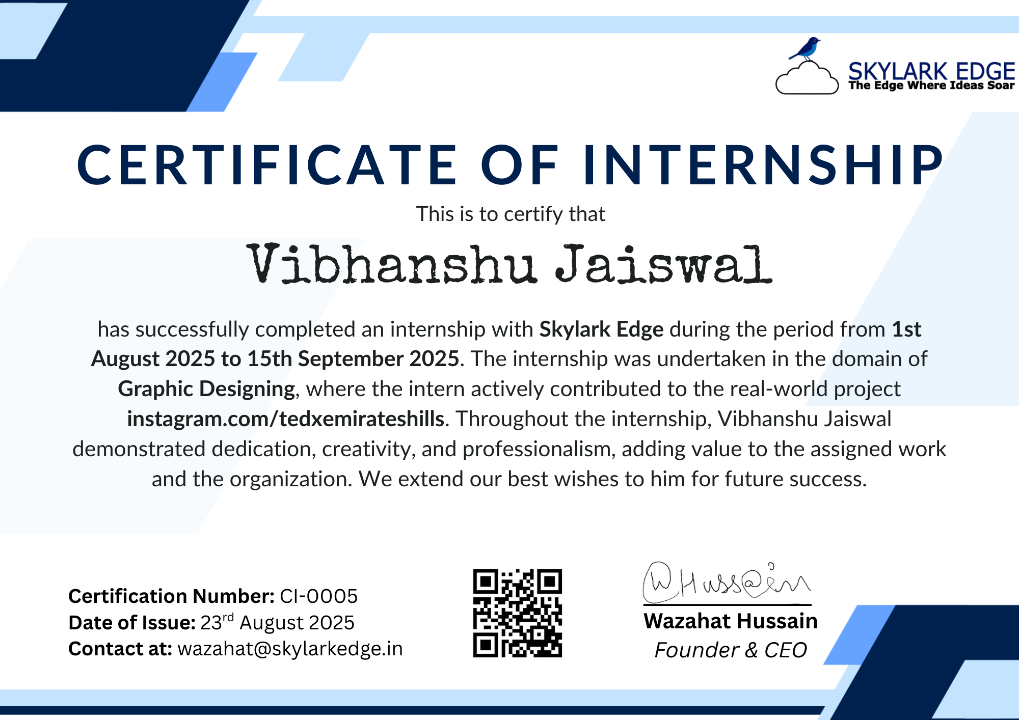 Certificate Number: CI-0005 Issued To:Vibhanshu Jaiswal Internship Duration: 1st August 2025 – 15th September 2025 Domain: Graphic Designing Project:instagram.com/tedxemirateshills
